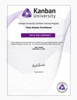 🏅 Po szkoleniu otrzymasz certyfikat udziału i tytuł Team Kanban Practitioner od Kanban University.